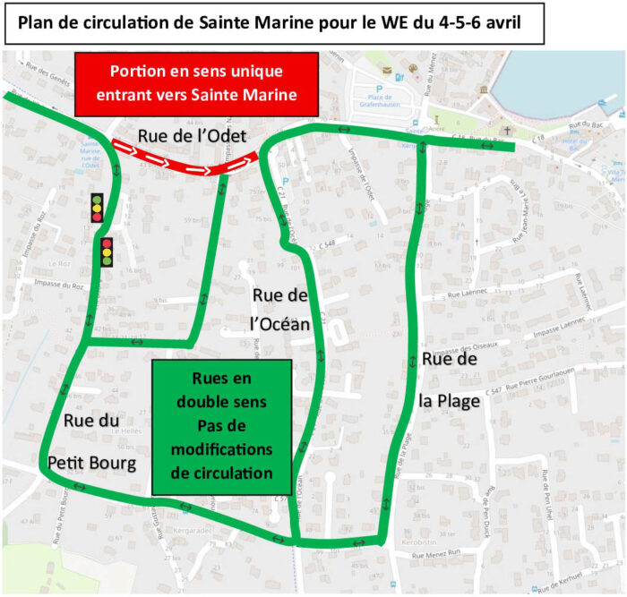 Durant le week-end de Pâques, la circulation sera modifiée. Il sera possible de circuler rue de l’Odet uniquement en sens unique à partir du croisement avec la rue du Petit bourg jusqu’à la rue de l’Océan. Les autres rues restent en double sens de circulation.